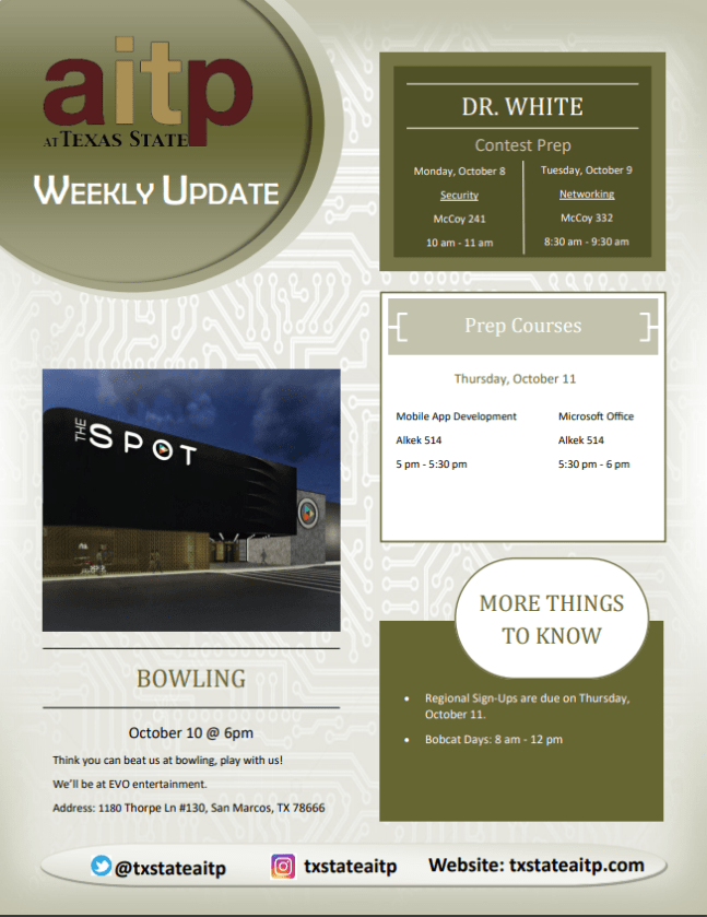 October Social Posted on October 9, 2018 by txstateitsa Tomorrow we have our October Social event at The Spot in San Marcos! If you think you’re a good bowler or just want to hang out come meet us at: 1180 Thorpe Ln #130, San Marcos, TX 78666 We hope to see you there! Share: Click to share on Facebook (Opens in new window) Facebook Click to share on X (Opens in new window) X Click to email a link to a friend (Opens in new window) Email