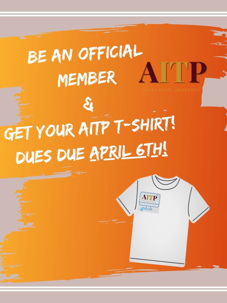 Dues deadline has been extended to April 6th! Don’t miss your opportunity to get an official AITP T-Shirt Posted on April 1, 2021 by txstateitsa Share: Click to share on Facebook (Opens in new window) Facebook Click to share on X (Opens in new window) X Click to email a link to a friend (Opens in new window) Email