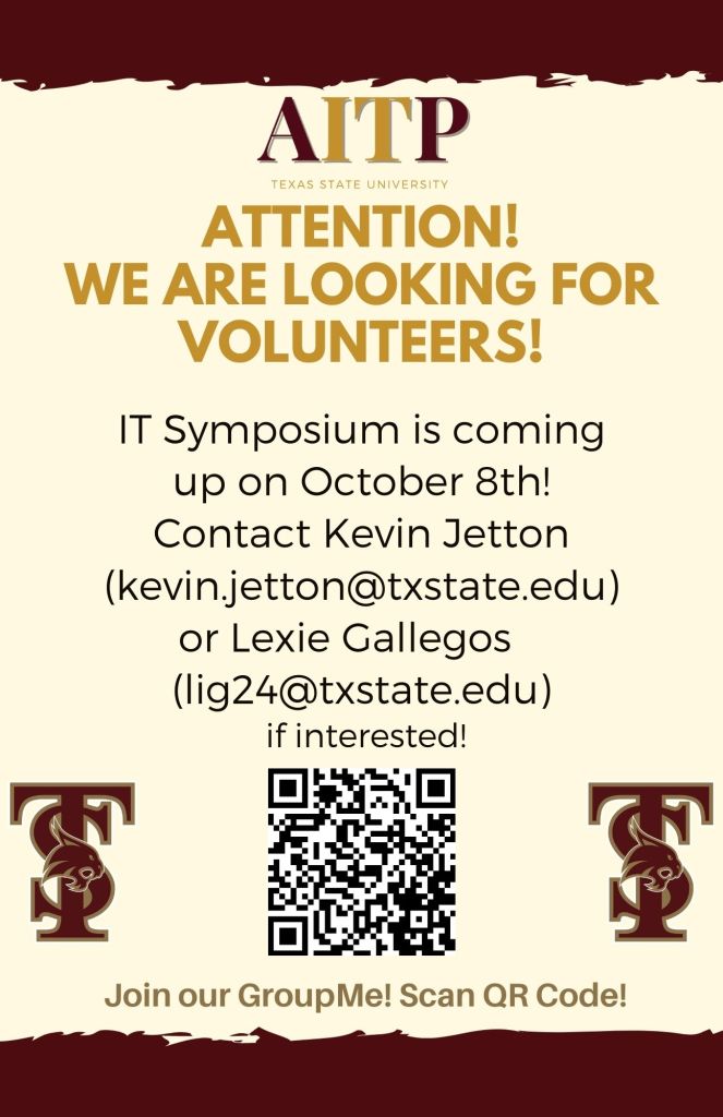 Happy Tuesday everyone! Reminder that our IT Symposium is next Friday, October 8. We are still looking for volunteers! This is an excellent opportunity for you to get involved and looks awesome on a resume. Please reach out if you have questions or need further information. Looking forward to seeing you there.