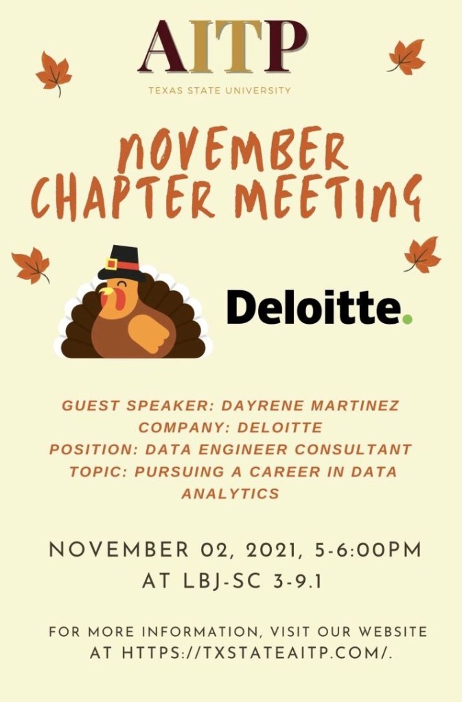 November Chapter Meeting! Posted on October 27, 2021 by txstateitsa Join us on Tuesday 11/2 for our monthly meeting with special guest from Deloitte. Share: Click to share on Facebook (Opens in new window) Facebook Click to share on X (Opens in new window) X Click to email a link to a friend (Opens in new window) Email