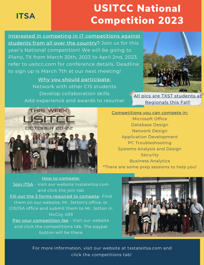 The U.S. Information Technology Collegiate Conference (USITCC) is intended to provide students who are studying information systems, information technology, and/or computer science (or closely-related disciplines) with an opportunity to showcase their skills, engage in IT-related competitions, and explore career opportunities.