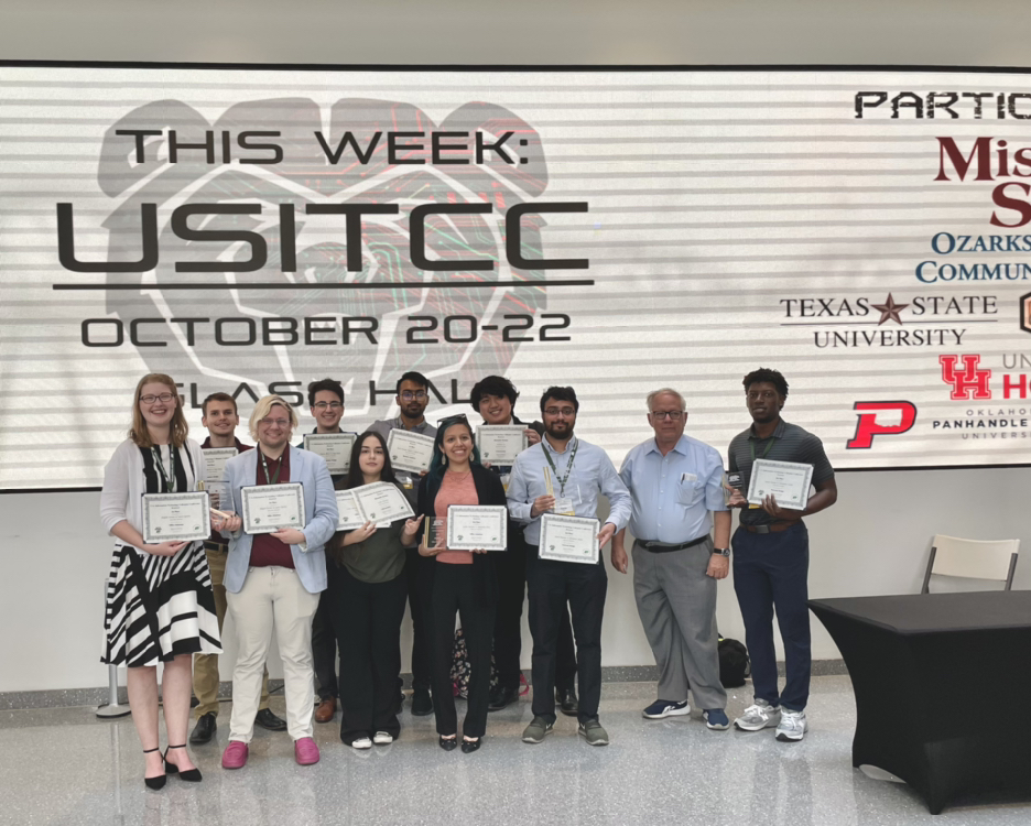 At the 2022 USITCC South Regionals this past weekend – a team of 15 students flew over to Springfield, MO to compete in 8 different IT competition events with Kevin Jetton & Elizabeth Jaimes as the van drivers and team chauffeur.